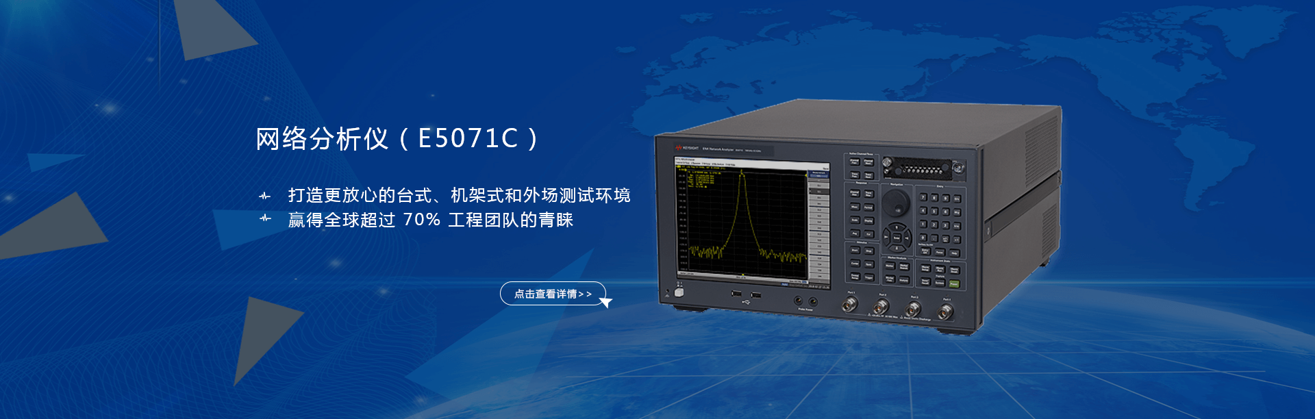 主要產(chǎn)品有:頻譜分析儀,網(wǎng)絡(luò)分析儀,綜合測(cè)試儀,藍(lán)牙wifi測(cè)試儀,噪聲系數(shù)測(cè)試儀,接收機(jī),電話測(cè)試儀,高、低頻信號(hào)源,音、視頻信號(hào)分析儀,高精度萬用表, LCR/ 電橋、各種通信電源等。經(jīng)營(yíng)的儀器品牌主要有:Keysight/Agilent (惠普 / 安捷倫)、 R/S (羅德 & 施瓦茨)、 Anritsu (安立)、Litepoint、 FLUK( 福祿克 ) 、 TEK (泰克)等。